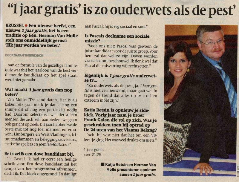 Wie wél een brief in de bus zal krijgen van Fevlado belangenverdediging in verband met correcte terminologie, is Herman Van Molle. In de eerste aflevering van 1 jaar gratis had hij het over “doventaal” en “doventolk”. Maar dat was het enige mindere punt, want de eerste aflevering was een plezier om naar te kijken, en Pascal is nog steeds in de running. Slim om die laatste vraag over het voetbal door te spelen! Hier nog een klein stukje uit De Morgen waar Van Molle het heeft over de Dove kandidaat.
