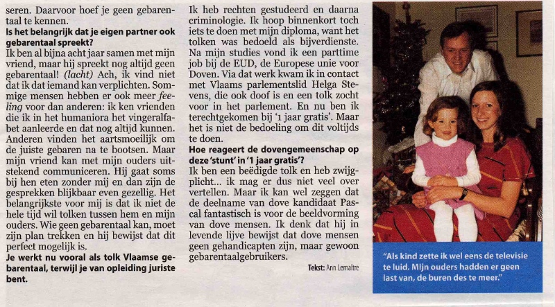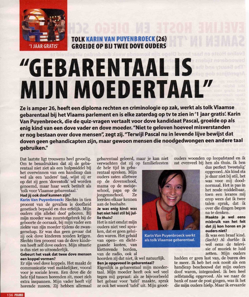 de media-aandacht in verband met de deelname van Pascal aan 1 jaar gratis. Vandaag verscheen in Primo TV-gids een interview met Karin Van Puyenbroeck, help tolk VGT van dienst.