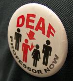 De studentenclub iDeas, die de kandidatuur van Rathmann ondersteunt, koos voor een badge en een variatie op het “Deaf President Now”-thema.