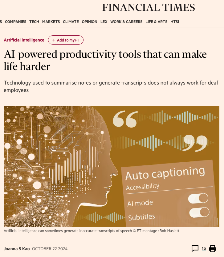 “Deaf scholar calls for community to be ‘assertive’ amid rise in AI sign language technology” O’Dell, L., 18 July 2025. https://liamodell.com/2025/07/18/sign-language-artificial-intelligence-british-sign-language-bsl-ai-signgpt-deaf-interpreters-maartje-de-meulder/